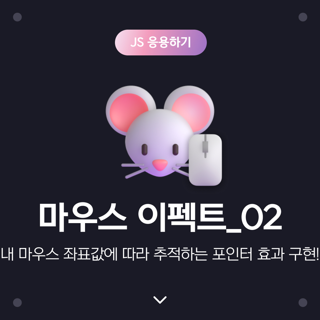 이번 "마우스 이펙트_02"예제에서는 마우스 포인터를 마우스가 위치한 좌표값에 따라 자연스럽고 알잘딱하게 따라가주는 이펙트를 구현해보도록 하겠습니다 ^----^v